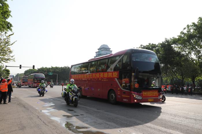 下午16點(diǎn)整,載著(zhù)賀州支援湖北醫療隊的大巴車(chē)在33輛摩托車(chē)鐵騎、兩輛警車(chē)的引導護航下駛入賀州大道,警燈閃爍、警笛嘹亮,沿途市民揮舞國旗,夾道歡迎,高聲歡呼,壽城人民用最高禮遇,最深敬意,迎接英雄凱旋,表達對英雄的敬意。
