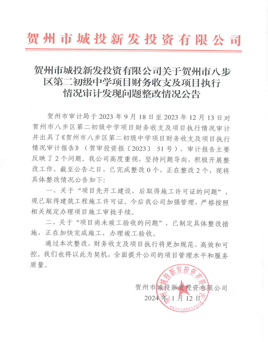 下一篇:廣西賀州城建投資集團有限公司2022年度財務(wù)收支情況審計整改情況公告